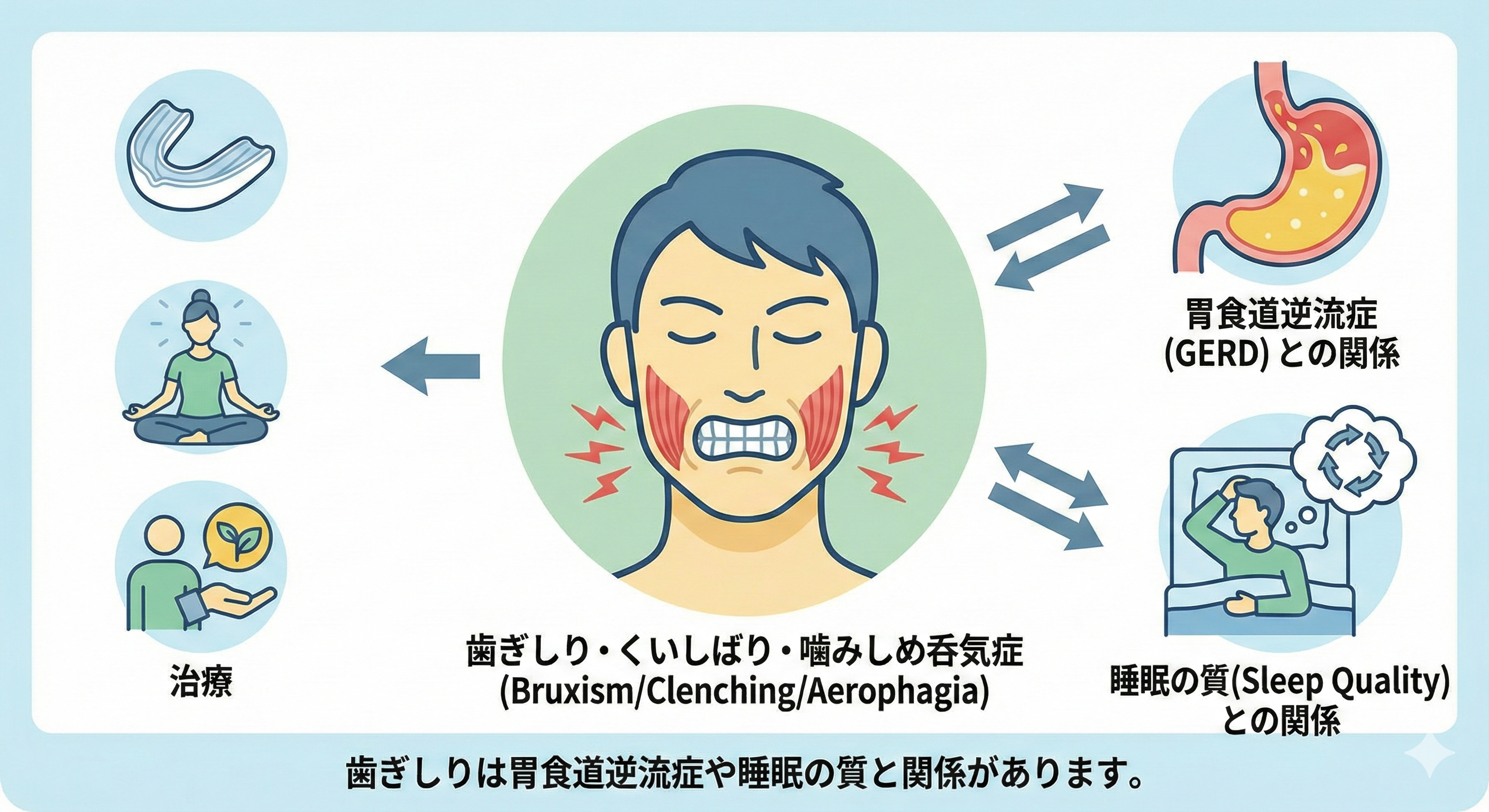 歯ぎしりは、単なるクセではなく、睡眠中の「脳と自律神経の活動」が深く関係しています。