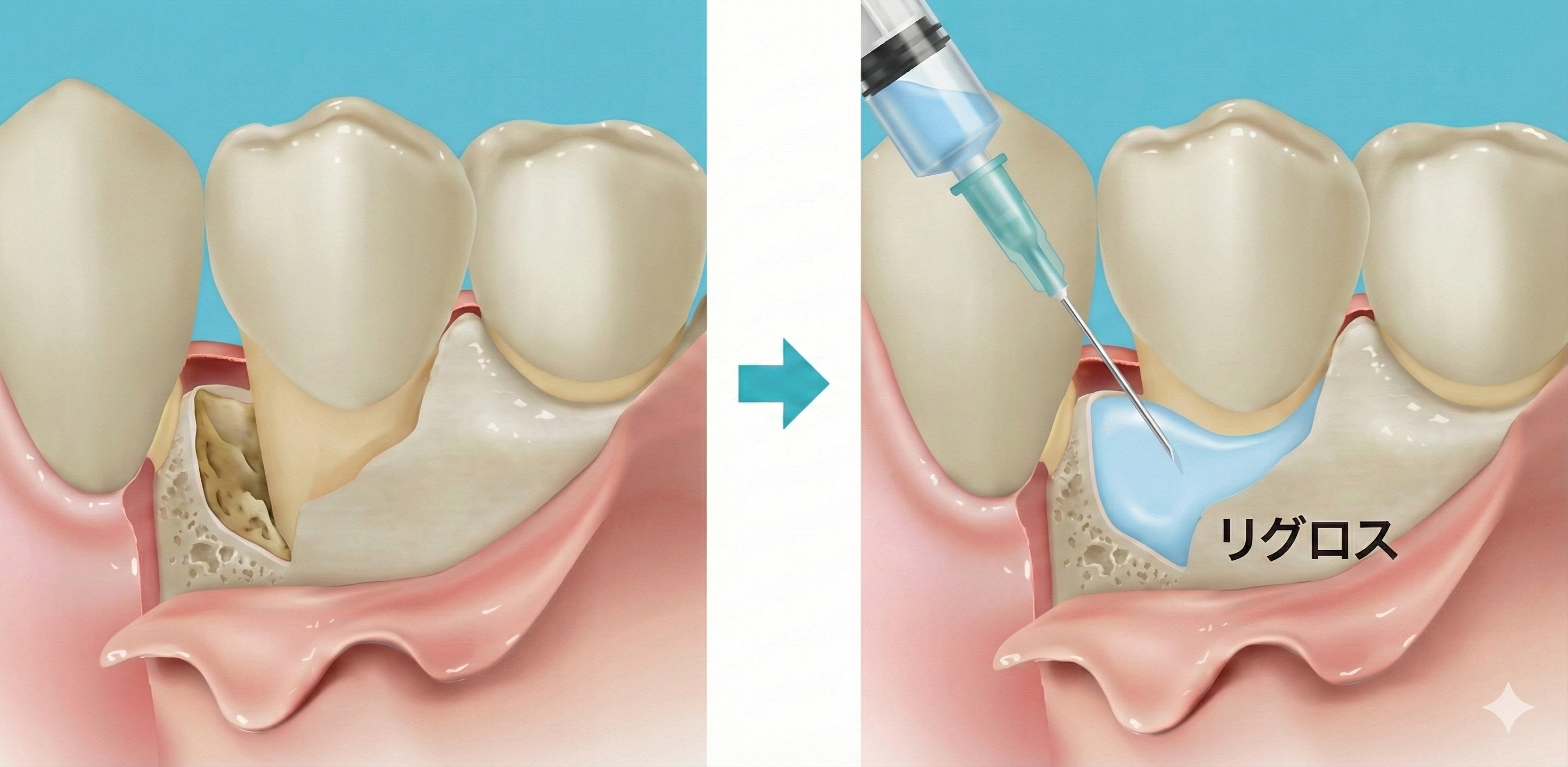 歯周病が悪化して、歯を支える骨が溶けてしまうと、放っておけば歯が抜け落ちてしまいます。そんな状況を救うのが、最新の再生医療を応用したお薬「リグロス」です。