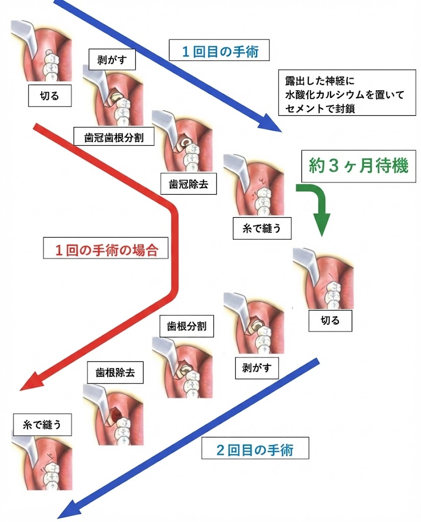 ■ 紹介するケースについて 親知らずの根の先がCTにて下歯槽神経に接する場合は通常総合病院の口腔外科を紹介しますが、2段階法もあります。口腔外科では専門医による手術、全身麻酔、精神鎮静法、入院、術後知覚障害の専門的治療などができます。