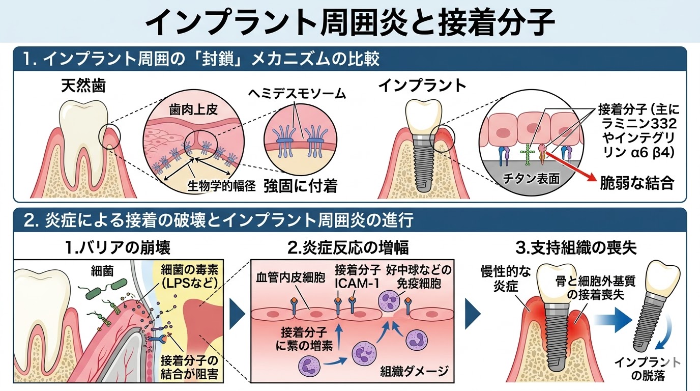 「インプラント周囲炎」のリスク インプラントには天然の歯にある「クッション(歯根膜)」がないため、細菌感染に弱く、歯周病に似た症状(インプラント周囲炎)になりやすい傾向があります。