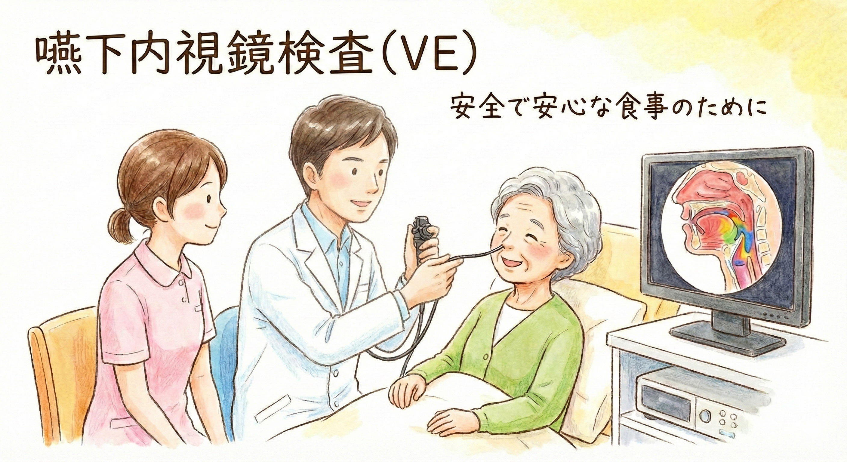 VE(嚥下内視鏡検査)の特徴について、専門用語を補足しつつ、どなたでも直感的に理解できるよう整理しました。