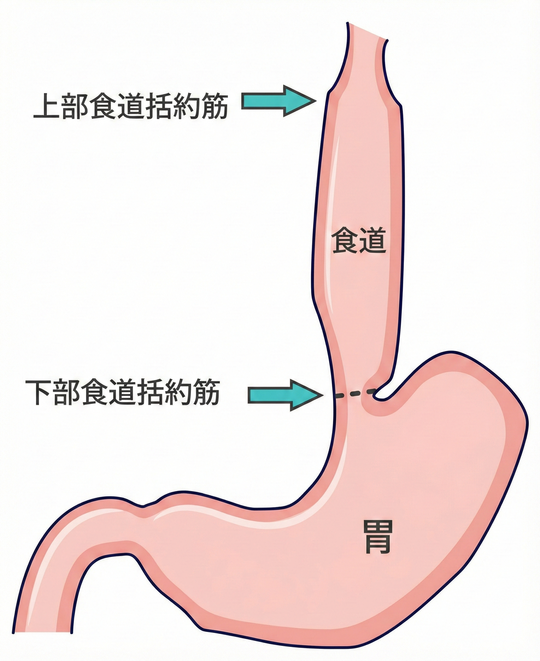 胃への入り口: 食道と胃の境目には「下部食道括約筋(かぶしょくどうかつやくきん)」という筋肉の締まりがあります。食べ物が来るとここが緩んで道を開き、胃へと送り込みます。
