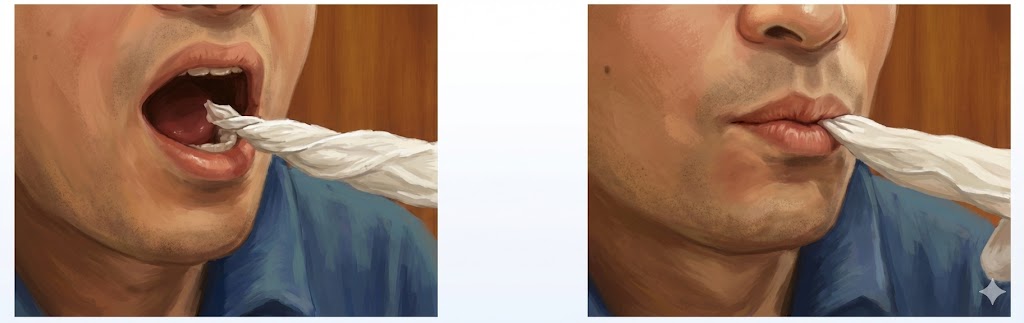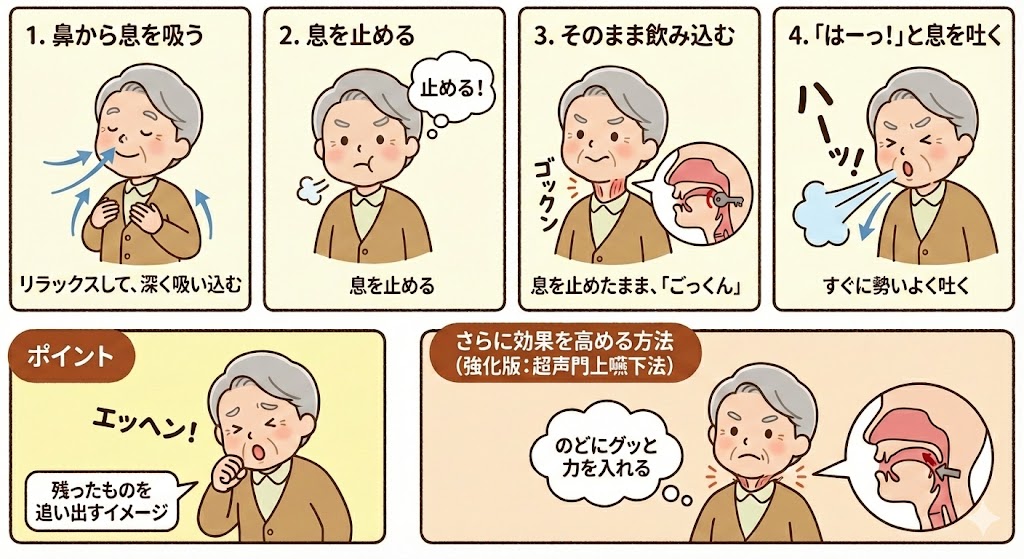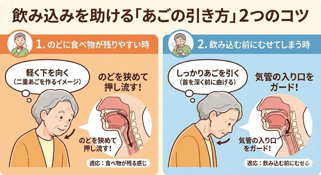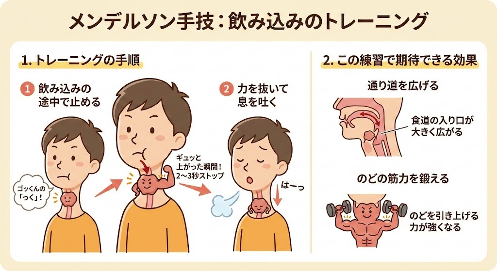 効果: 悪い方の通り道を物理的にふさぐことで、食べ物がきれいな通り道(元気な側)を流れるようになり、のどに残る量を減らせます。