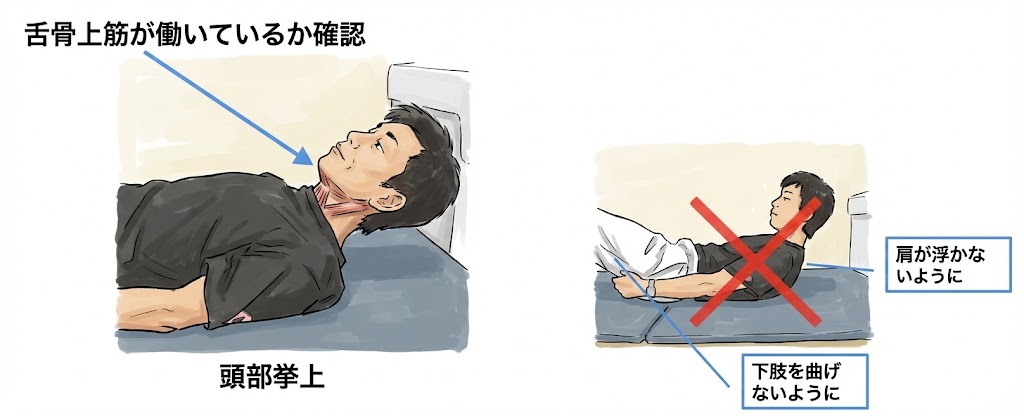 仰向けになって頭を持ち上げた状態をキープしたり、あごを引く動作に少し力を加えたりすることで、力強く飲み込むための基礎体力をつくります。