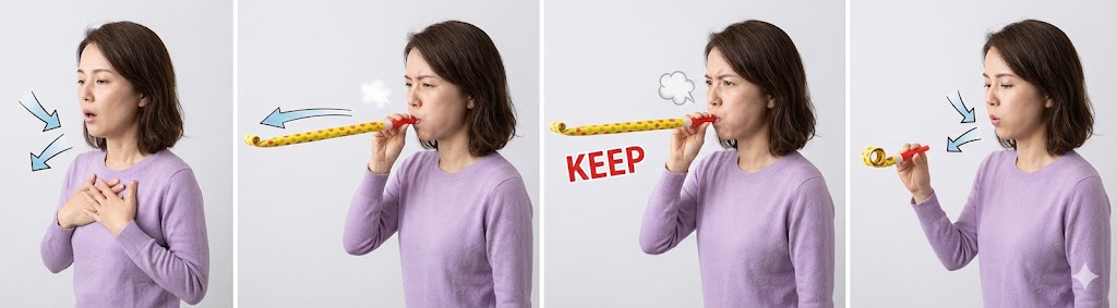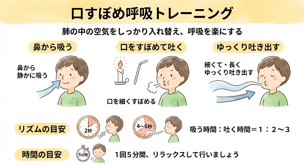 口を開けて行う: 口を閉じたりすぼめたりせず、大きく開けたまま息を出すのがコツです。