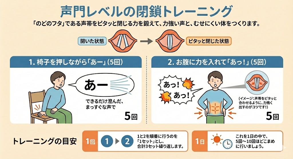 のどに優しい: 普通の「せき」よりも喉の体力を消耗しにくいため、繰り返し練習できます。