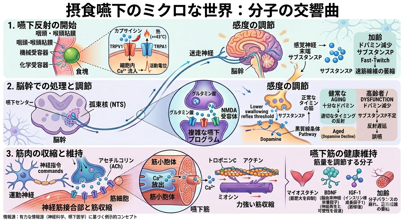 実は、首の動かしにくさや体のふらつきは、「飲み込む力」に大きく関係しています。