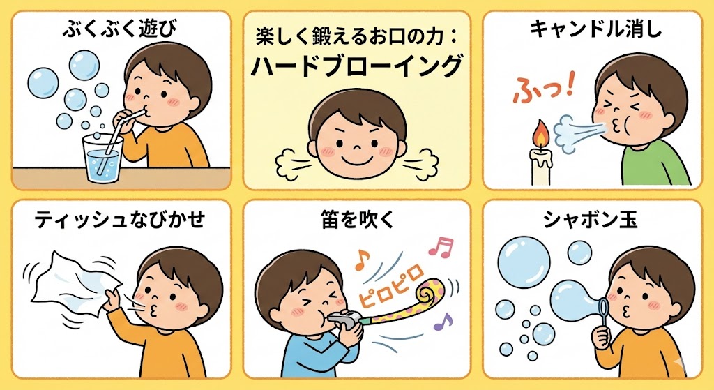 お口の周りの筋肉と、肺の力を同時に鍛える運動です。