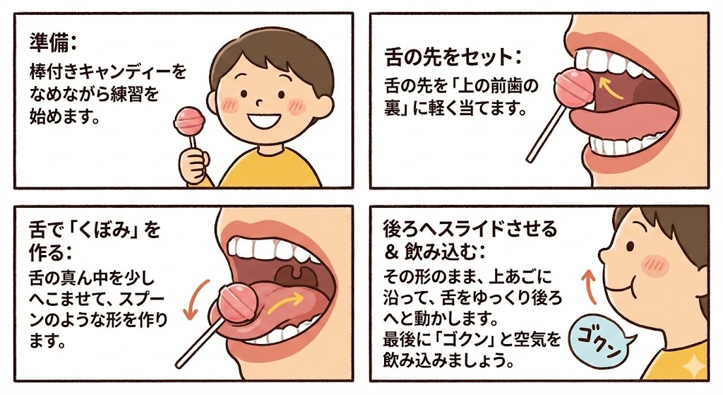 密閉する: お口をしっかり閉じ、舌の先を上の前歯の裏側にぴたっとくっつけます。