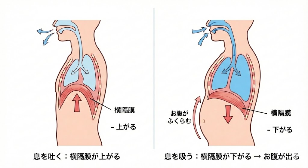 お腹に空気を入れる 姿勢を正し、お腹をふくらませるイメージで深く息を吸い込みます(腹式呼吸)。