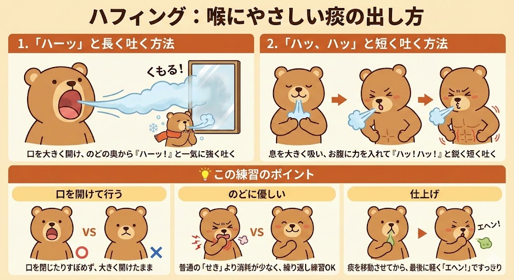 仕上げ: この「ハーッ」という呼吸で痰をのどの上の方まで移動させたあと、最後に「エヘン!」と軽くせきをすると、すっきり排出できます。