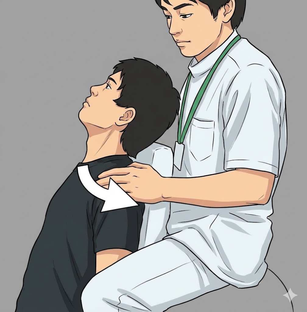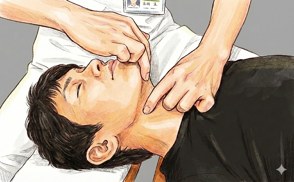 介助者がのどの骨(舌骨)をやさしく支えた状態で、首をゆっくり伸ばすことで、のどの上下の動きをスムーズにします。