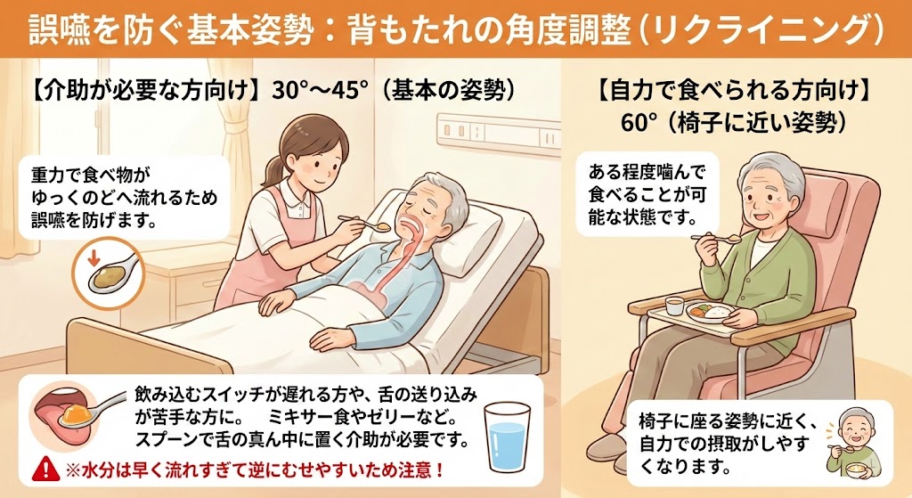 注意点: 誤嚥のリスクが最も高い姿勢でもあります。足の裏をしっかり床につけ、骨盤を立てて安定させることが大切です。