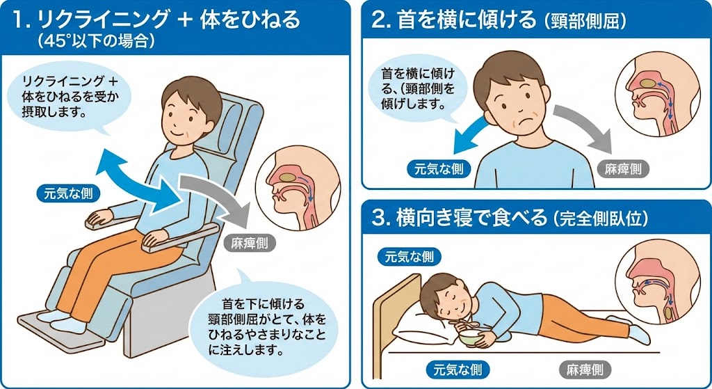 背もたれを倒した状態で、**麻痺のない側(元気な方)**に体を少しひねります。食べ物を元気な側に集めることで、スムーズな飲み込みを助けます。