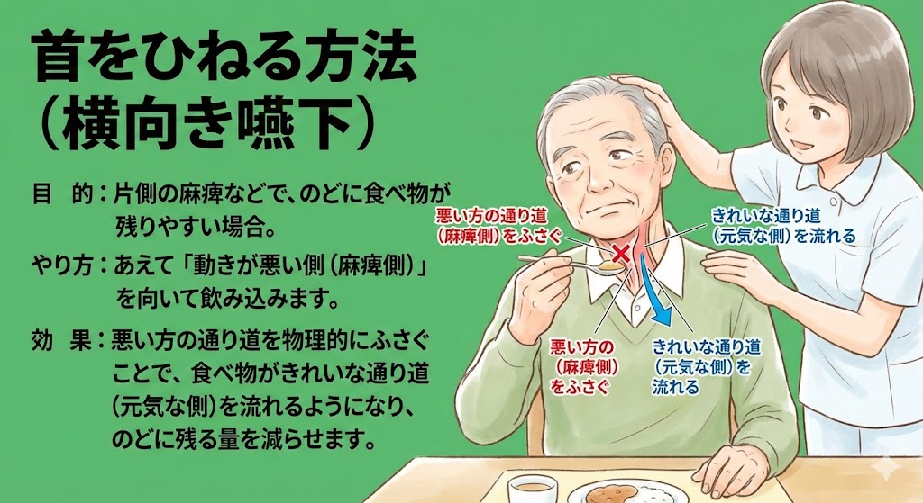 やり方: あえて「動きが悪い側(麻痺側)」を向いて飲み込みます。