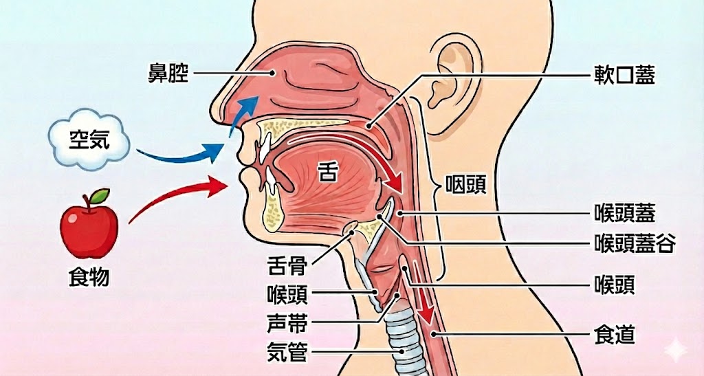 | 喉頭蓋(こうとうがい) | 気道をふさぐ「フタ」です。飲み込む瞬間に倒れて、気道をガードします。 |
