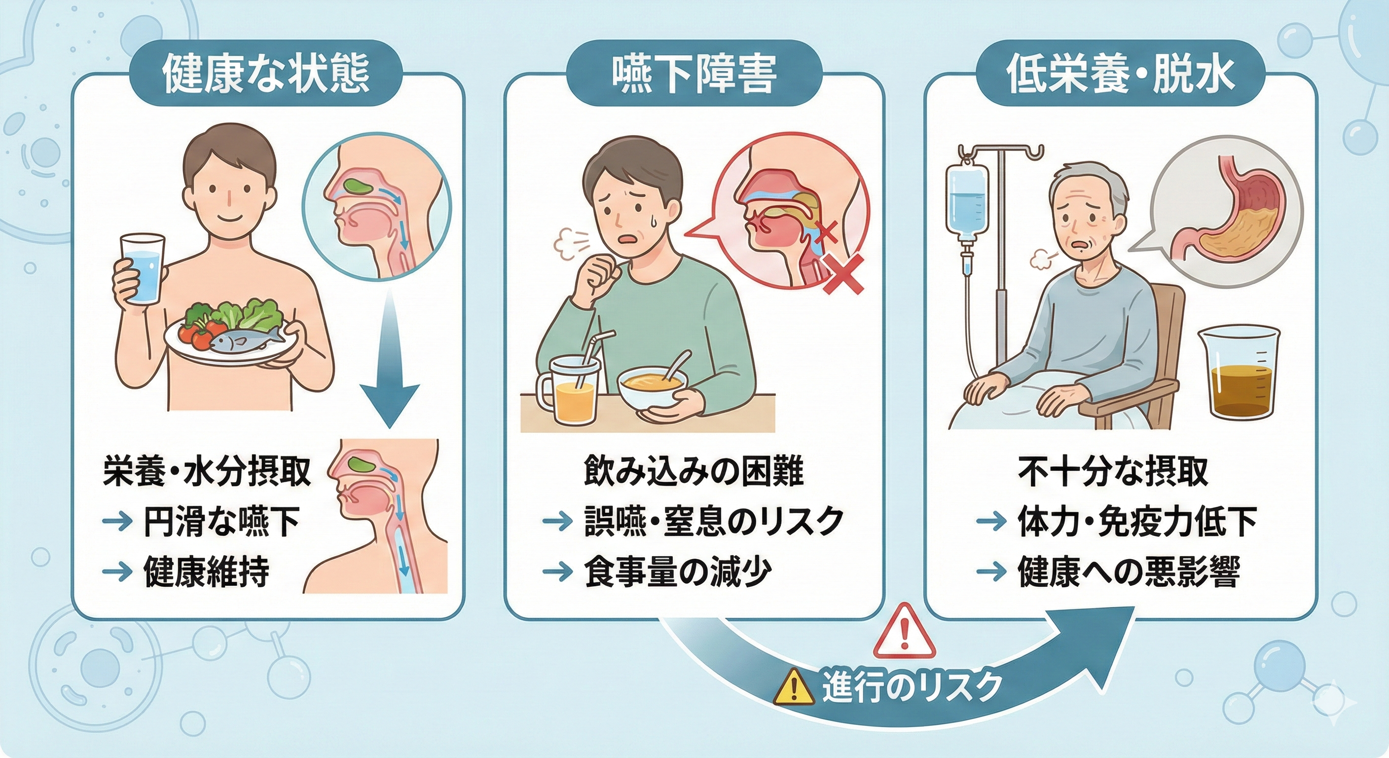 「食べられない」から「もっと動けない」の悪循環を防ぐ 栄養不足が続くと、全身の筋肉が落ちる「サルコペニア」という状態になります。実は、喉の筋肉も例外ではありません。喉の筋肉が衰えると、食べ物や飲み物をうまく飲み込めなくなる「嚥下(えんげ)障害」を引き起こしてしまいます。