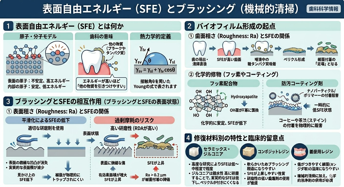 ブラッシングは虫歯や歯周病の予防、歯周病の治療に非常に重要です。歯周病の治療においては、ブラッシングがメインであり、歯科医師や歯科衛生士が行う歯石除去や手術や歯の固定などはサブと言えます。定期検診やメインテナンス、虫歯の治療、詰め物や入れ歯などの作りもの治療も大事ですが、日々のブラッシングが最も重要です。そこで、まず、表面自由エネルギーのコンセプトを説明し、その後、日常のブラッシングの具体的な方法をお知らせしたいと思います。