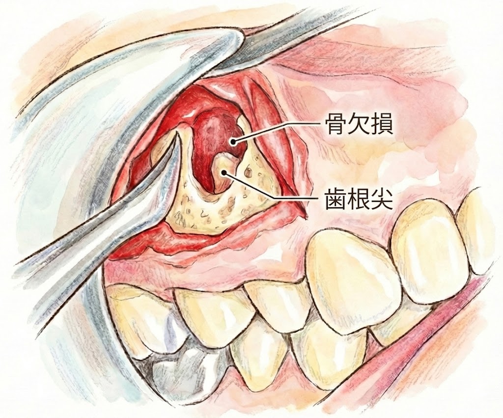 通常の根管治療(歯の内側の掃除)では治りきらない場合、外科的に根の先の病巣を取り除くことで、抜歯を回避できる可能性があります。