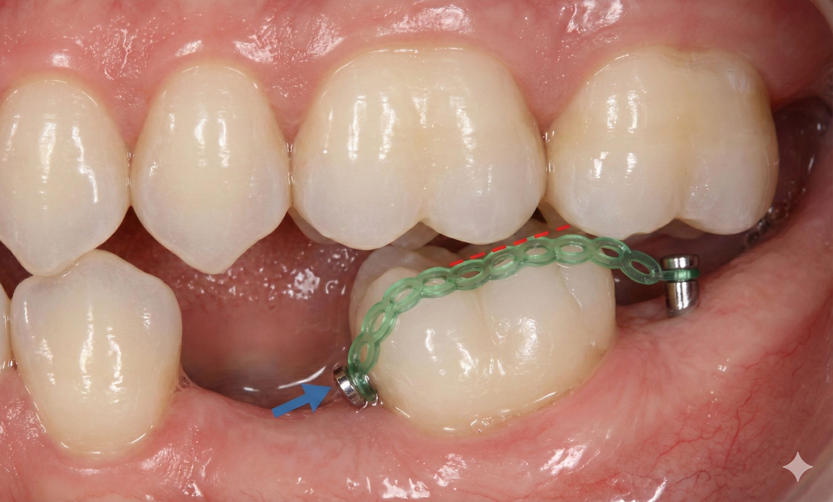 仕組み: 歯ぐきの骨に極小のネジを設置し、そこを起点にゴムの力で歯を理想的な位置まで引き起こします。