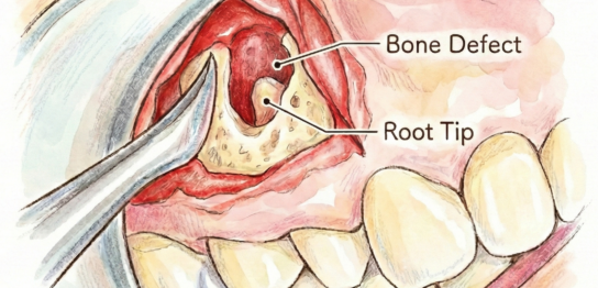 歯根の先に病巣(膿の袋)ができて歯ぐきの腫れや痛みがでた場合、根管治療(歯根の中